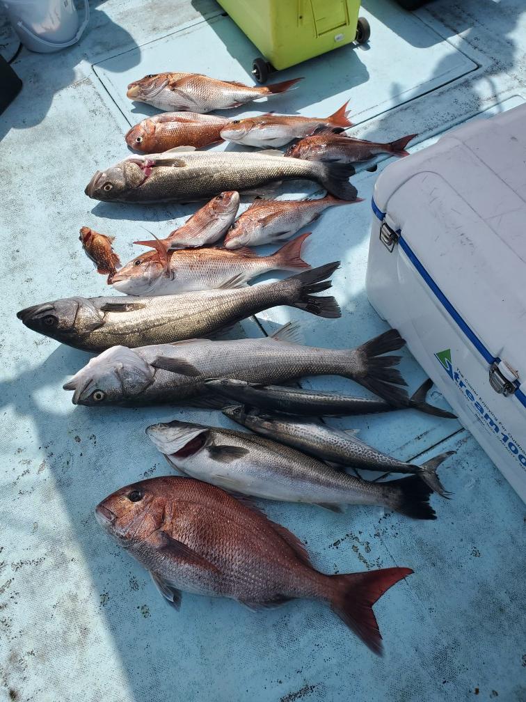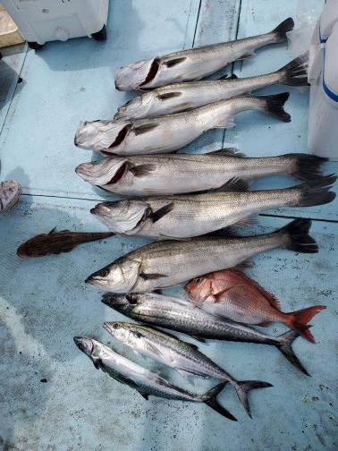 スズキ4匹、真鯛8匹、サゴシ2匹、カサゴ2匹